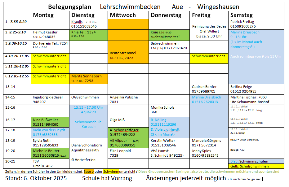Es fallen immer mal wieder Gruppen aus und dann bleibt das Bad ungenutzt. Sie können sich beim Verein melden oder direkt bei einer Gruppe Ihrer (Zeit-) Wahl. Bei den grün markierten laufen Sie offene Türen sein.