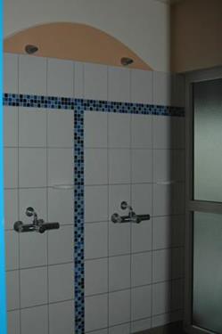 direkt vor dem Schwimmbad: vier komfortable Duschen sowie Handtuchhaken (saniert 2011).